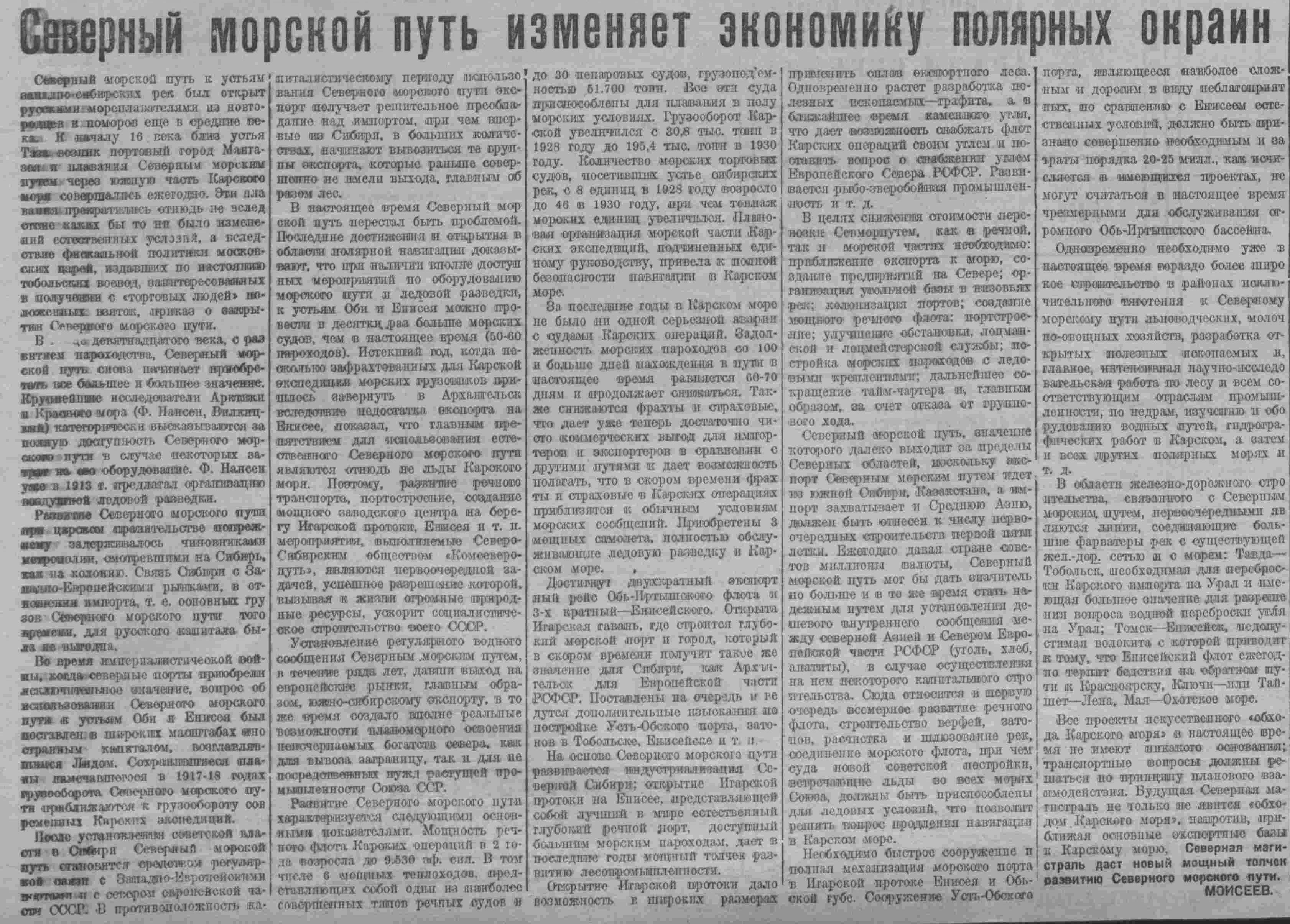 Пройдет 8-10 лет и настойчивость человеческого гения, его энергия и самоотверженная работа превратят эти дькие и пустынные места в культурный оазис. По берегам Обской и Тазовской губы Енисейского залива, Лены, Колымы, Индигирки и других рек будет гореть электрическим светом маяки задымят громадные трубы благоустроенных перегрузочных портов, элеваторов и доков, введется электрическое освещение в жилых рабочих помещений, будут функционировать радиостанции, соединяющие отдаленные участки северного морского пути, зареют гидропланы над поверхностью неприветного и ледяного Карского моря и целыми группами поплывут корабля, перевозя на десятки и сотни миллионов равных грузов и снабжая всем необходимым Сибирь и вывозя избытки ее сырья и производств.