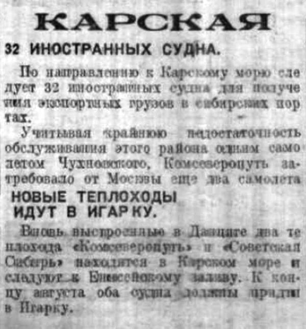 Вновь выстроенные в Данциге два теплохода «Комсеверопуть» и «Советская Сибирь» находятся в Карском море и следуют к Енисейскому заливу. К концу августа оба судна должны придти в Игарку.