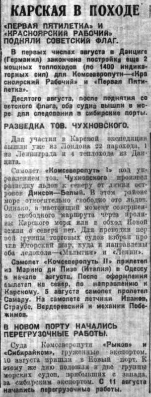 Вновь выстроенные в Данциге два теплохода «Комсеверопуть» и «Советская Сибирь» находятся в Карском море и следуют к Енисейскому заливу. К концу августа оба судна должны придти в Игарку.