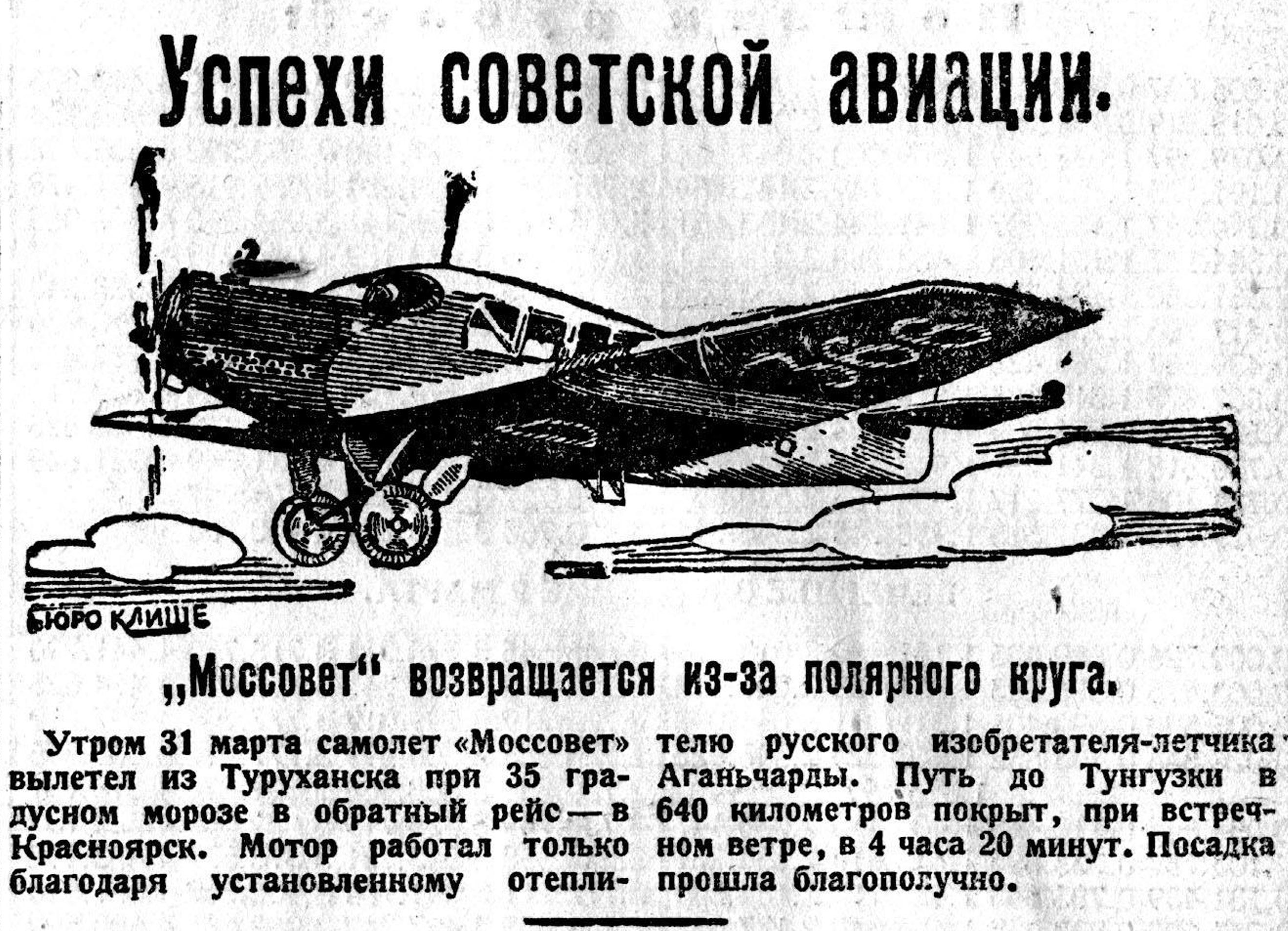 Утром 31 марта самолет «Моссовет» вылетел из Туруханска при 35 градусном морозе в обратный рейс — в Красноярск. Мотор работал только благодаря установленному отеплителю русского изобретателя - летчика Аганьчарды. Путь до Тунгузки в 640 километров покрыт, при встречном ветре, в 4 часа 20 минут. Посадка прошла благополучно.