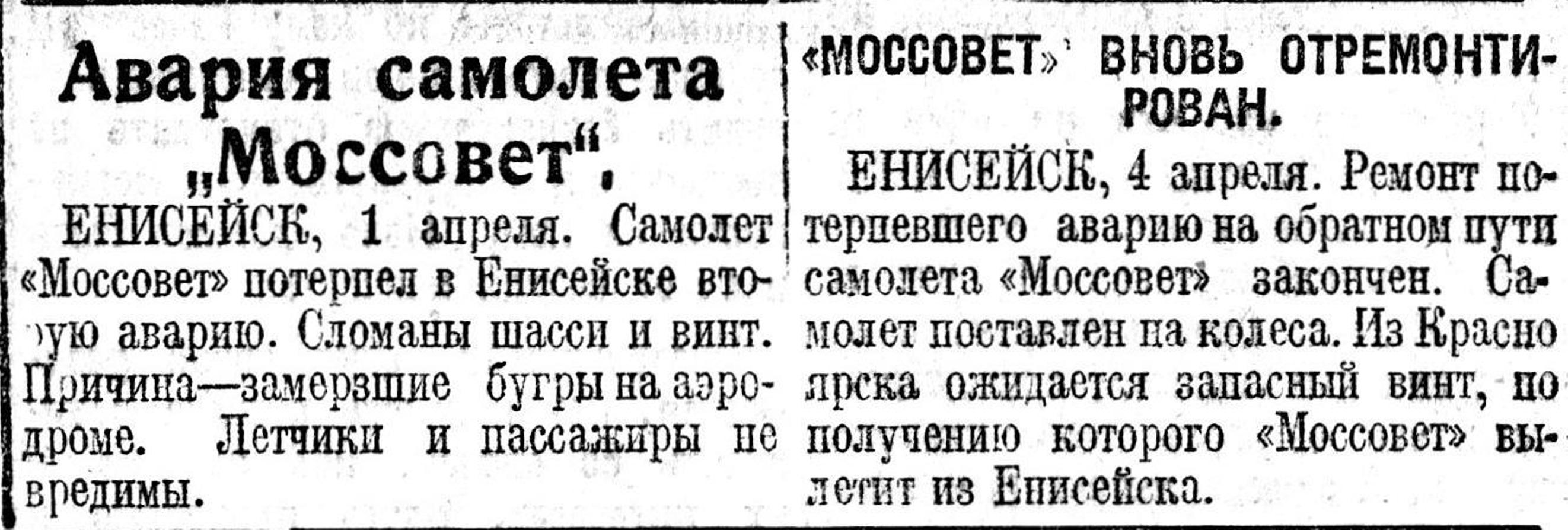 ЕНИСЕЙСК, 1 апреля. Самолет «Моссовет» потерпел в Енисейске вторую аварию. Сломаны шасси и винт. Причина — замерзшие бугры на аэродроме. Летчики и пассажиры невредимы.