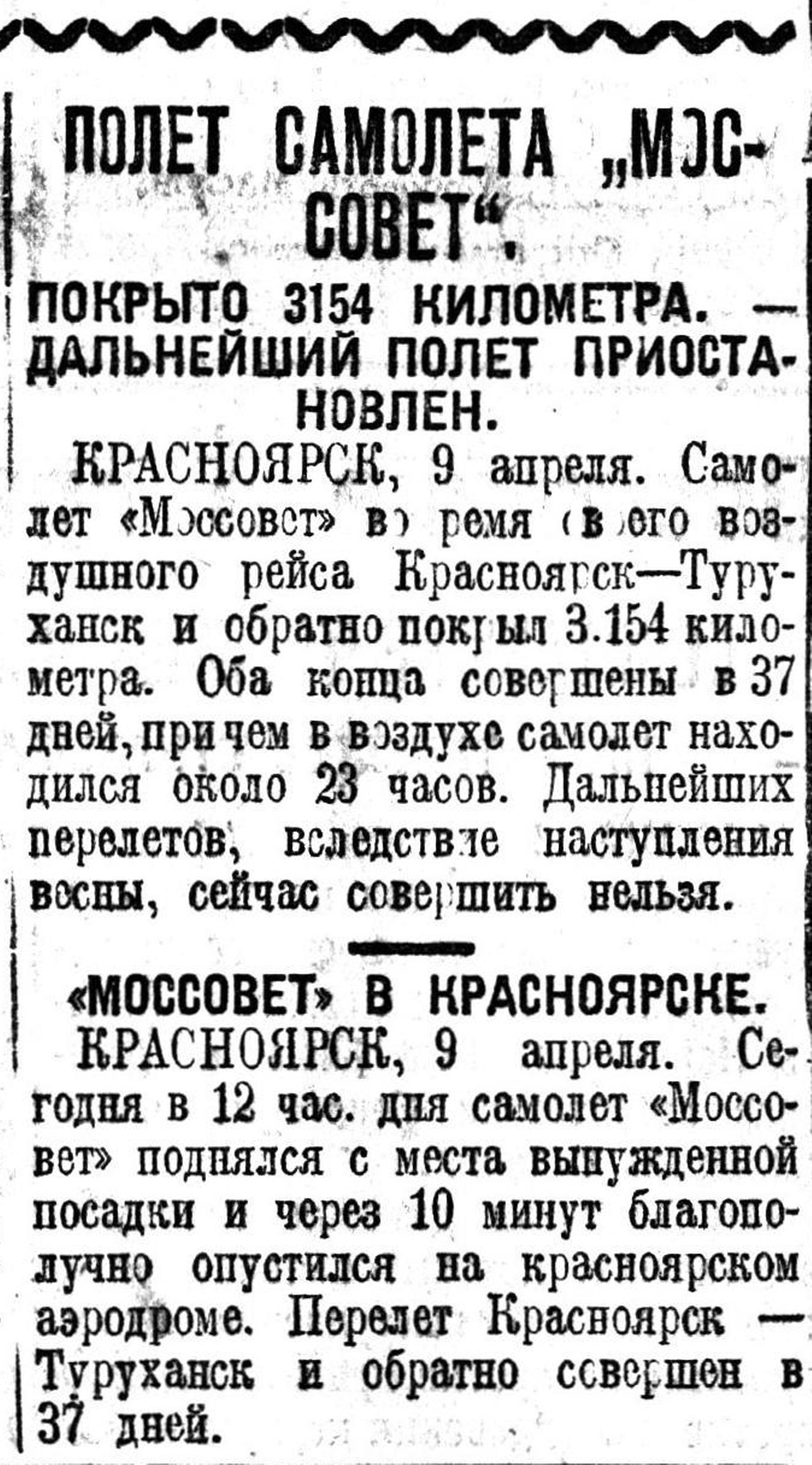 ♦ Самолет «Моссовет» 8-го апреля вылетел из Енисейска. В 12 часов самолет пролетел над станцией Шила в 60-ти верстах от Красноярска, после чего известий нет. Предполагается вынужденная посадка.