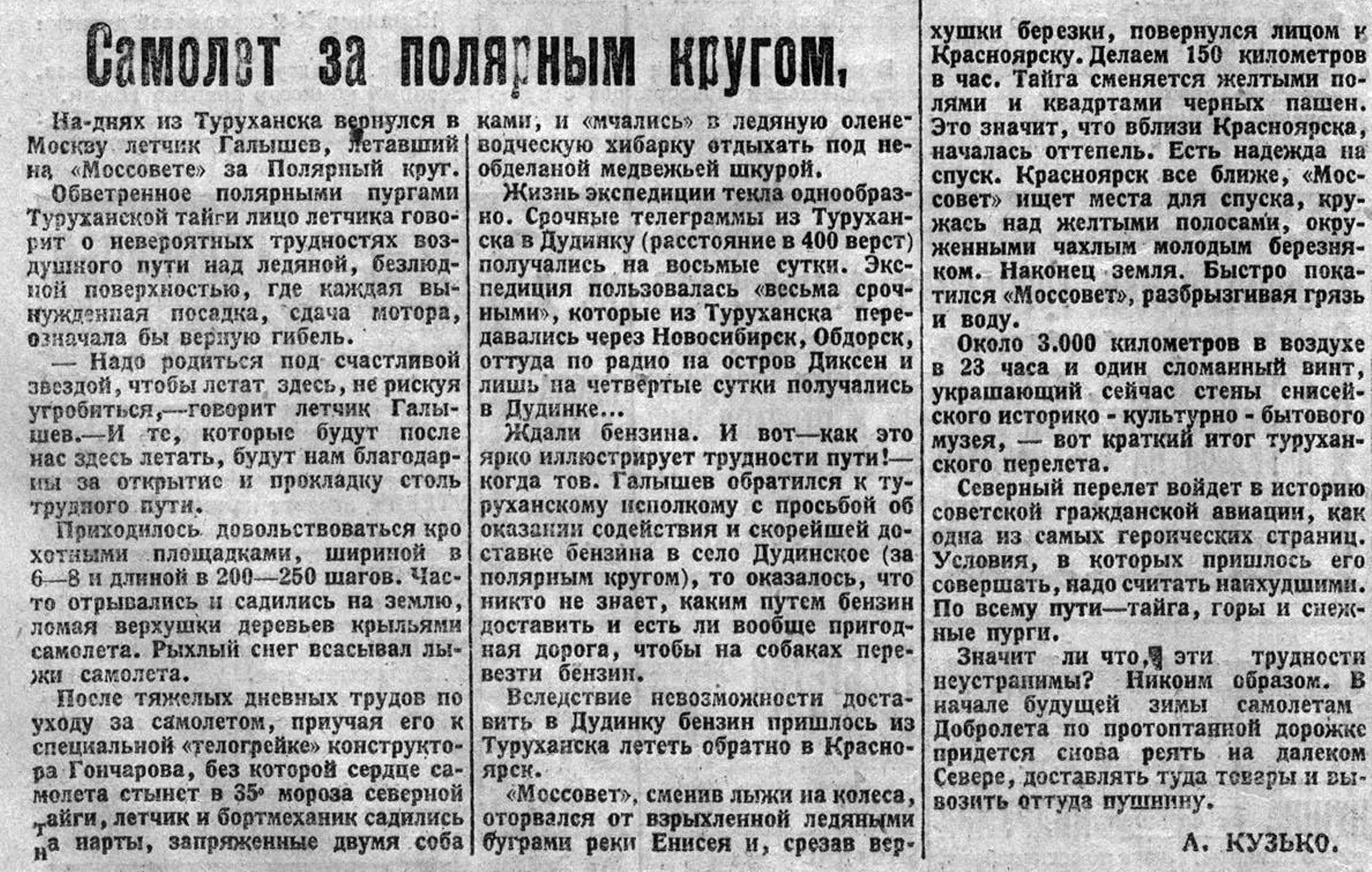 На-днях из Туруханска вернулся в Москву летчик Галышев, летавший на «Моссовете» за Полярный круг.
