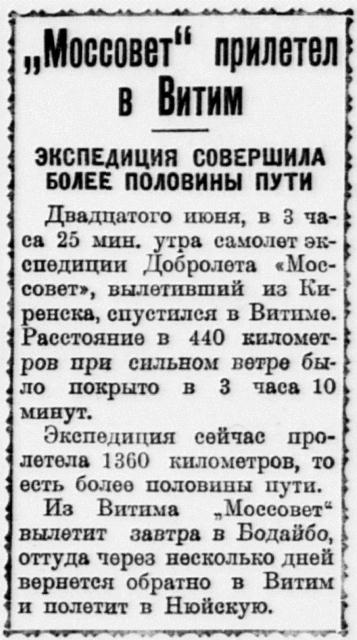 Двадцатого июня, в 3 часа 25 мин. утра самолет экспедиции Добролета «Моссовет», вылетевший из Киренска, спустился в Витиме. Расстояние в 440 километров при сильном ветре было покрыто в 3 часа 10 минут.