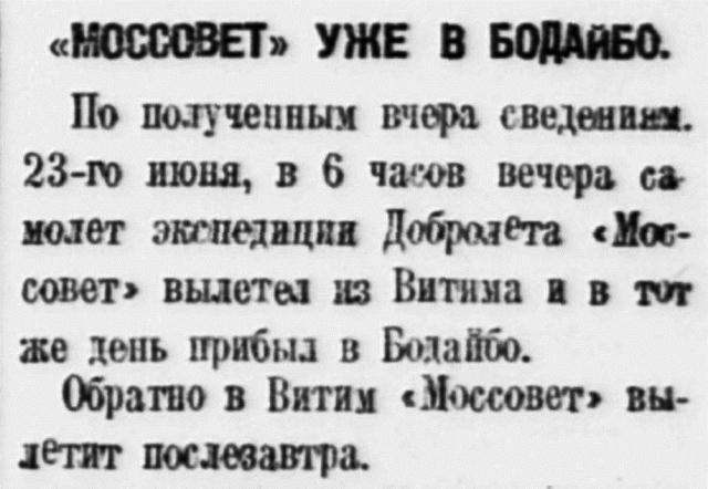 По полученным вчера сведениям, 23-го июня, в 6 часов вечера самолет экспедиции Добролета «Моссовет» вылетел из Витима и в тот же день прибыл в Бодайбо.