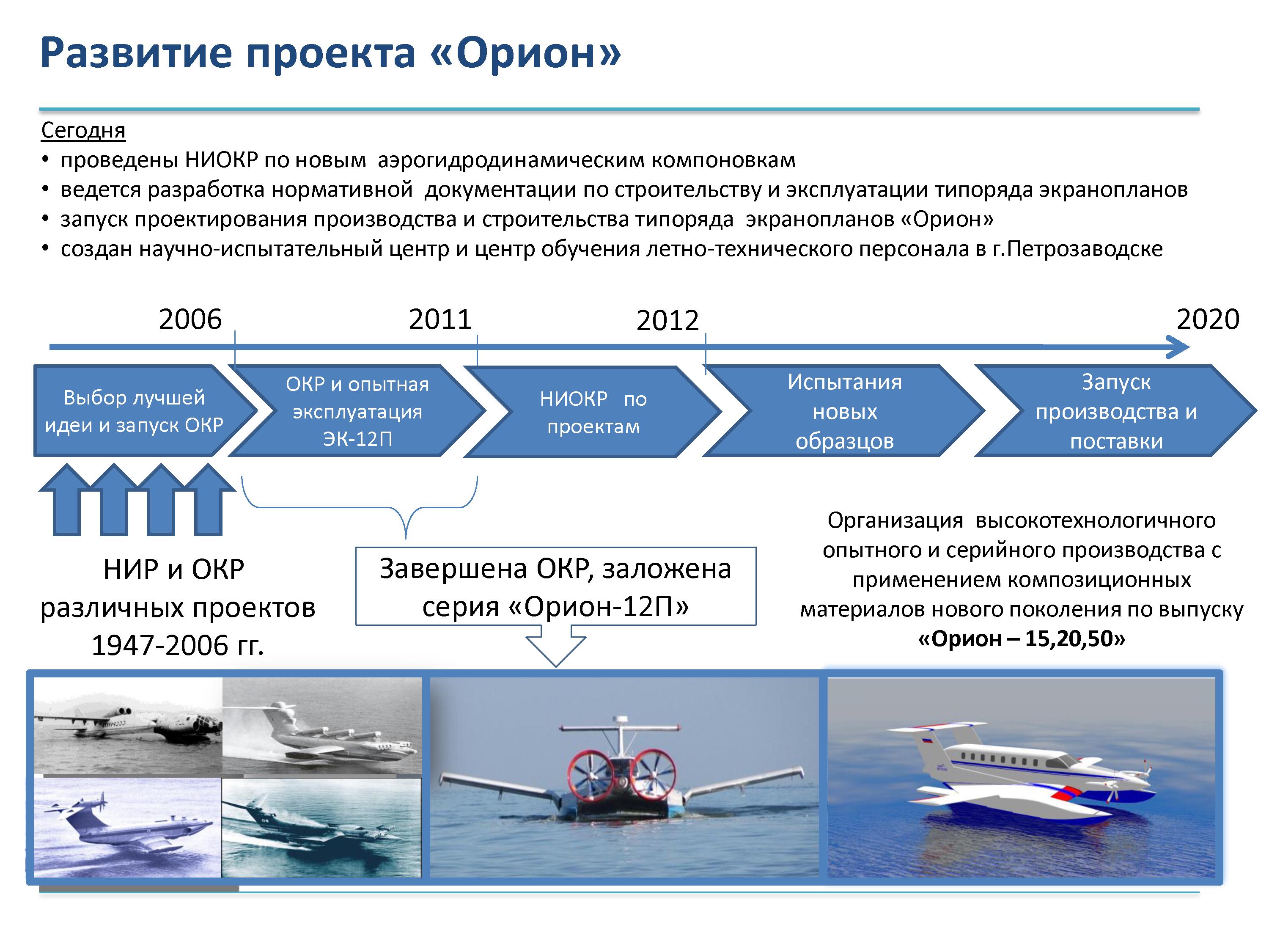 Экраноплан «Орион-20» создала и ведёт испытания «Ассоциация разработчиков, производителей и потребителей экранопланов «ЭКРАНОПЛАН» (г.Москва). Предполагается, что машина в перспективе будет активно применяться в т.ч. в Арктике.
