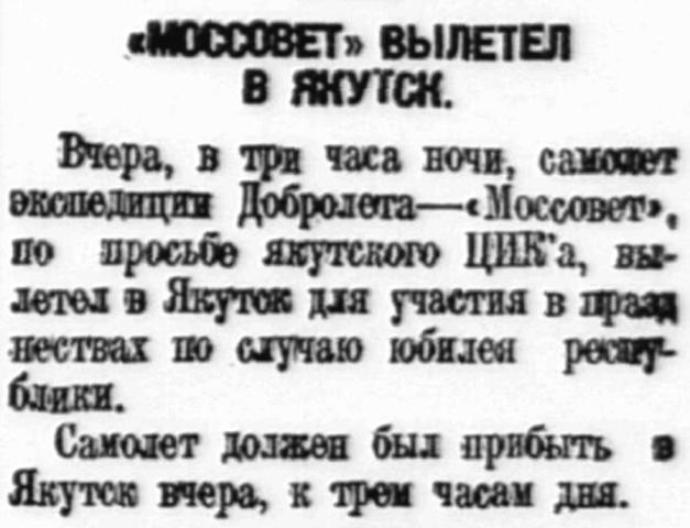 Вчера, в три часа ночи, самолет экспедиция Добролета — «Моссовет», по просьбе якутского ЦИКа, вылетел в Якутск для участия в празднествах по случаю юбилея республики.