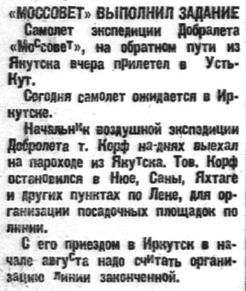 26 августа самолет Добролета "Моссовет" прибыл в Якутск. Весь перепет прошел вполне благополучно. Сегодня самолет вылетает обратно в Иркутск.