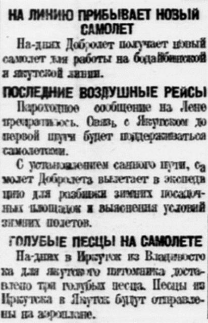 Вчера, в 6 часов по местному времени вылетел в Якутск самолет Добролета «Моссовет» с первой воздушной почтой. Более тысячи почтовых отравлений было погружено на самолет.