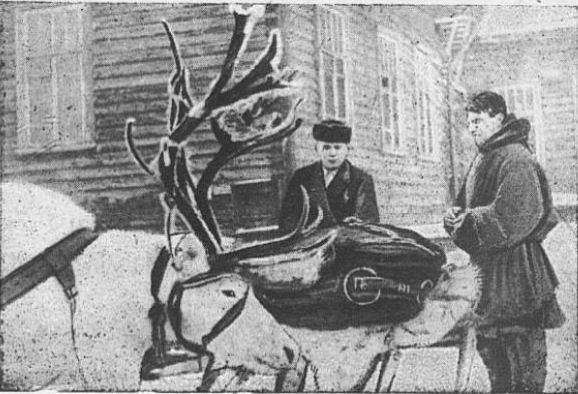 Почтовые олени из Териберки. Почтальон В.Стрелков передаёт