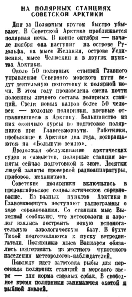 Советские полярники включились в предоктябрьское социалистическое соревнование. Из разных пунктов Арктики в Главсевморпуть поступают радиограммы о ходе соревнования. Со станции мыс Выходной сообщают, что метеорологи и аэролог взялись построить новую вспомогательную аэрологическую базу. В бухте Тихой подготовляются к пуску ветродвигатели. Полярники мыса Ванкарем обязались подготовить из местного чукотского населения метеорологов-наблюдателей.