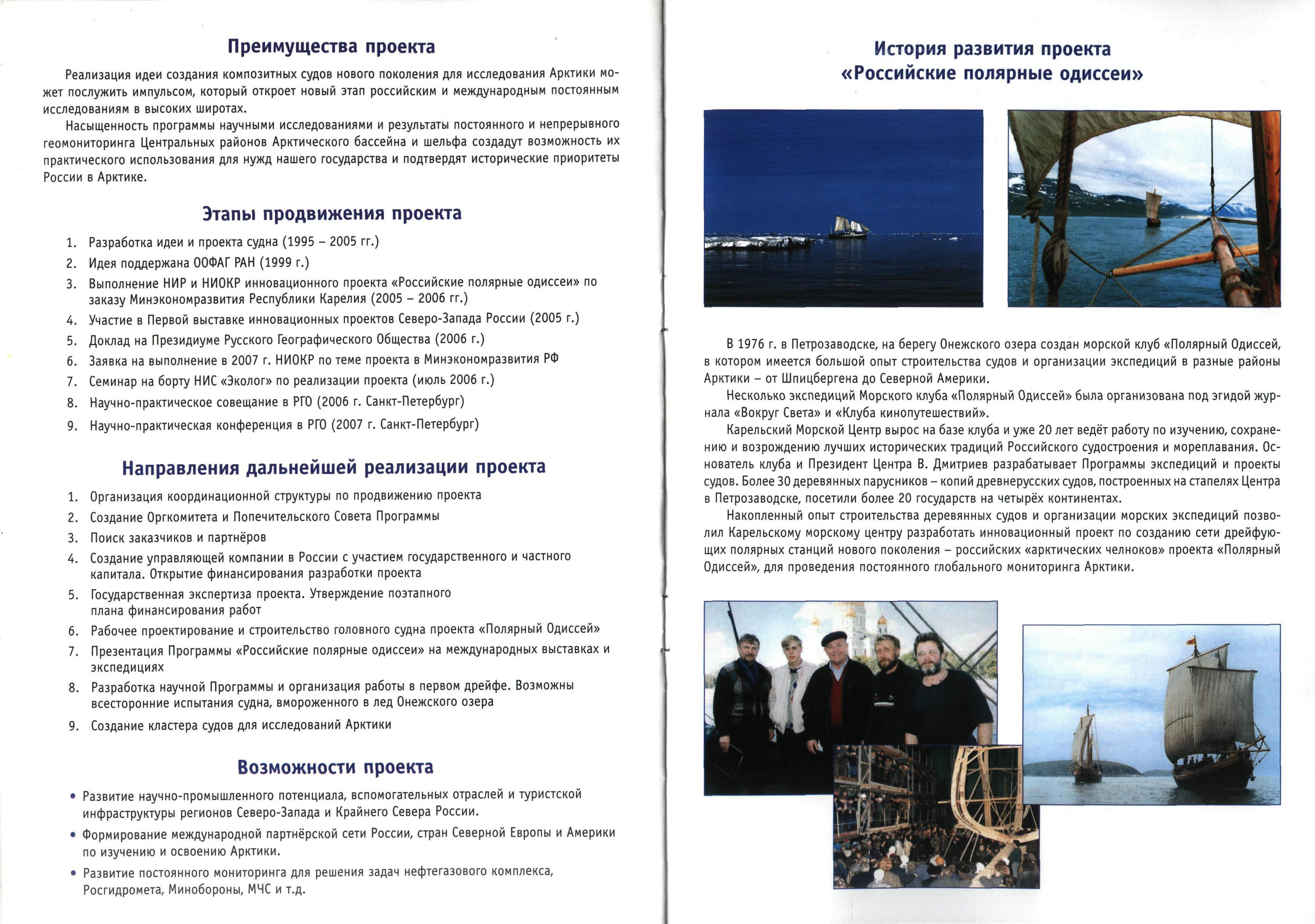16.11.2006 Перспективы использования спроектированных в Карелии (петрозаводское объединение «Морской центр» и судзавод "Авангард") уникальных дрейфующих станций для исследования Арктики обсуждались на научно-практической конференции в Санкт-Петербурге. В связи с подготовкой к Международному году Арктики и 70-летию начала работы Первой российской дрейфующей станции СП-1 в рамках совместного заседания Океанографической и Полярной комиссий Русского Географического общества прошла первая научно-практическая конференция «Перспективы строительства серии научно-исследовательских композитных судов проекта «Полярный Одиссей» для проведения постоянного мониторинга Арктики, научных исследований, обеспечения задач обороны и нефтегазового комплекса и развития высокоширотного туризма». В рабочем проектировании принимают участие КБ «Восток» ЦНИИ Технологии Судостроения, ГКНПЦ им. Хруничева и НПО им. Лавочкина.
