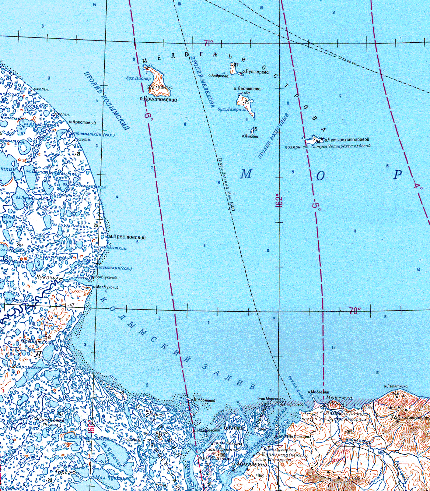 Координаты 70,38 СШ и 162,24 ВД. Магнитное склонение 2 гр. W. Постоянная разница между средним и декретным московским временем (45 гр. Е) равна 7 часов 50 мин.