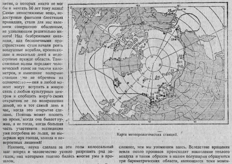 и Европу, сказывается и на уменьшении средств, отпускаемых государственными казначействами на надобности науки и культуры. Лишь советская программа работ не только включает в себя все задания, намеченные к исполнению для Полярного года, но и значительно превышает план Международной комиссии. План работ Второго Полярного года был встречен восторженно со стороны советской ученой общественности, и можно считать, что со стороны СССР будет сделано все, чтобы: осуществить максимум пожеланий ученых всего мира. В советскую программу включается, по данным The Polar Record (1931, № 2), организация двенадцати магнитных станций и трех аэрологических станций, на которых будут применяться радиозонды проф. П. А. Молчанова, для изучения верхних слоев атмосферы.