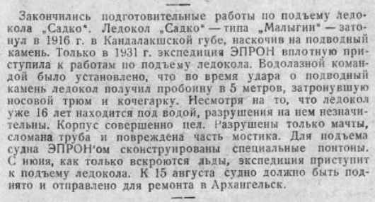 Белого моря для под’ема затонувшего в 1915 году большого ледокола «Садко».