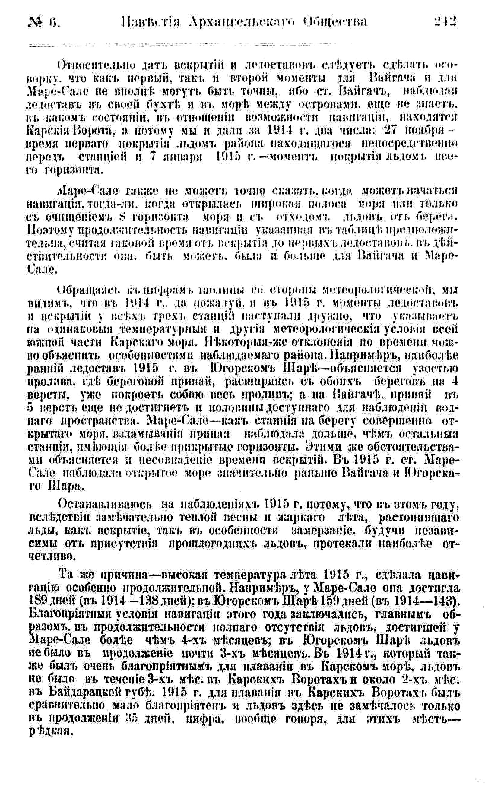 К настоящему времени, т. е. к началу 1916 г., наблюдатели Карского моря имели возможность проследить целиком две навигации, начиная от вскрытия проливов в 1914 г. до замерзания их на зиму 1915—16 года.