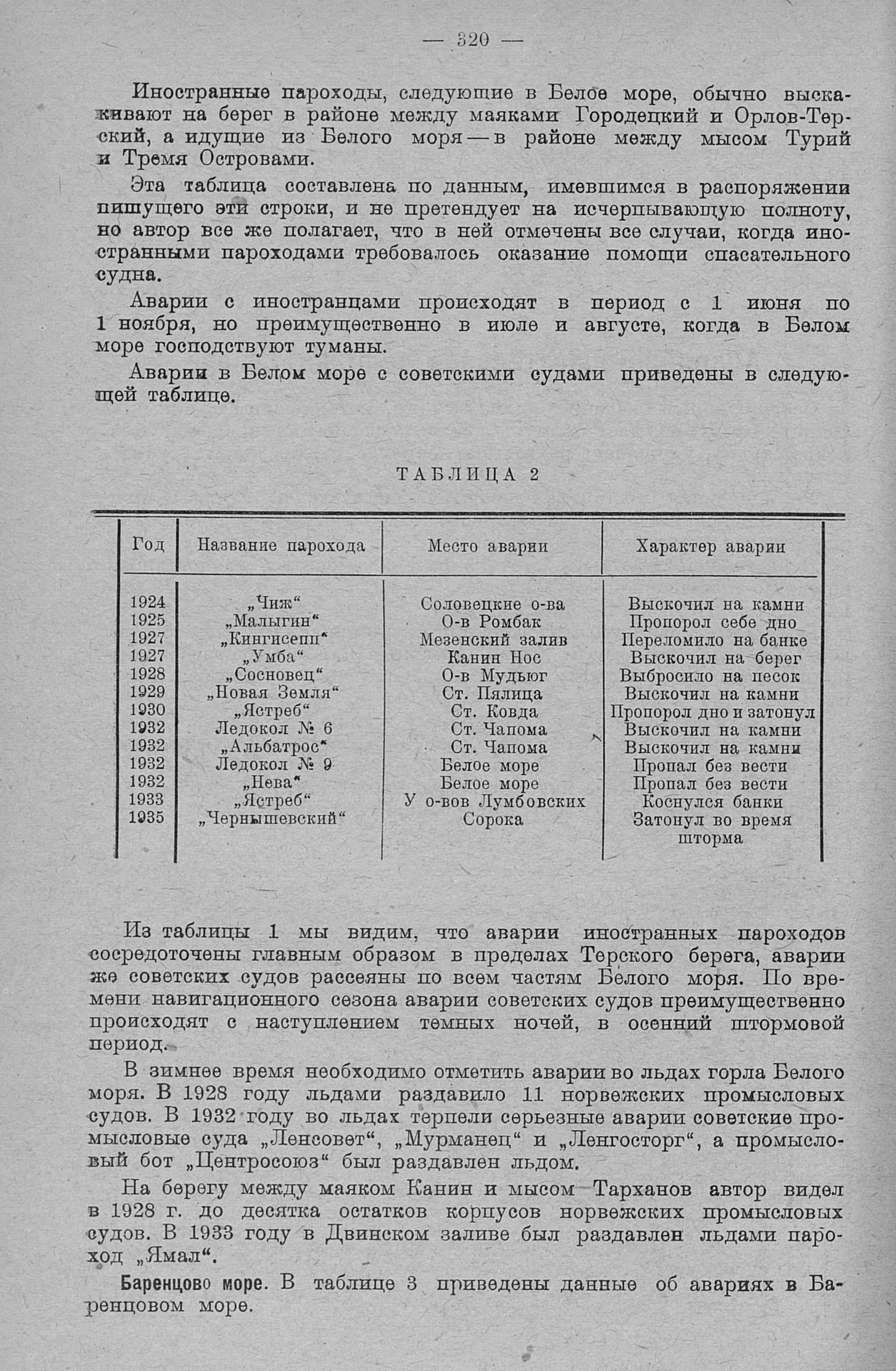 Из таблицы 1 мы видим, что аварии иностранных пароходов сосредоточены главным образом в пределах Терского берега, аварии же советских судов рассеяны по всем частям Белого моря. По времени навигационного сезона аварии советских судов преимущественно происходят с наступлением темных ночей, в осенний штормовой период.