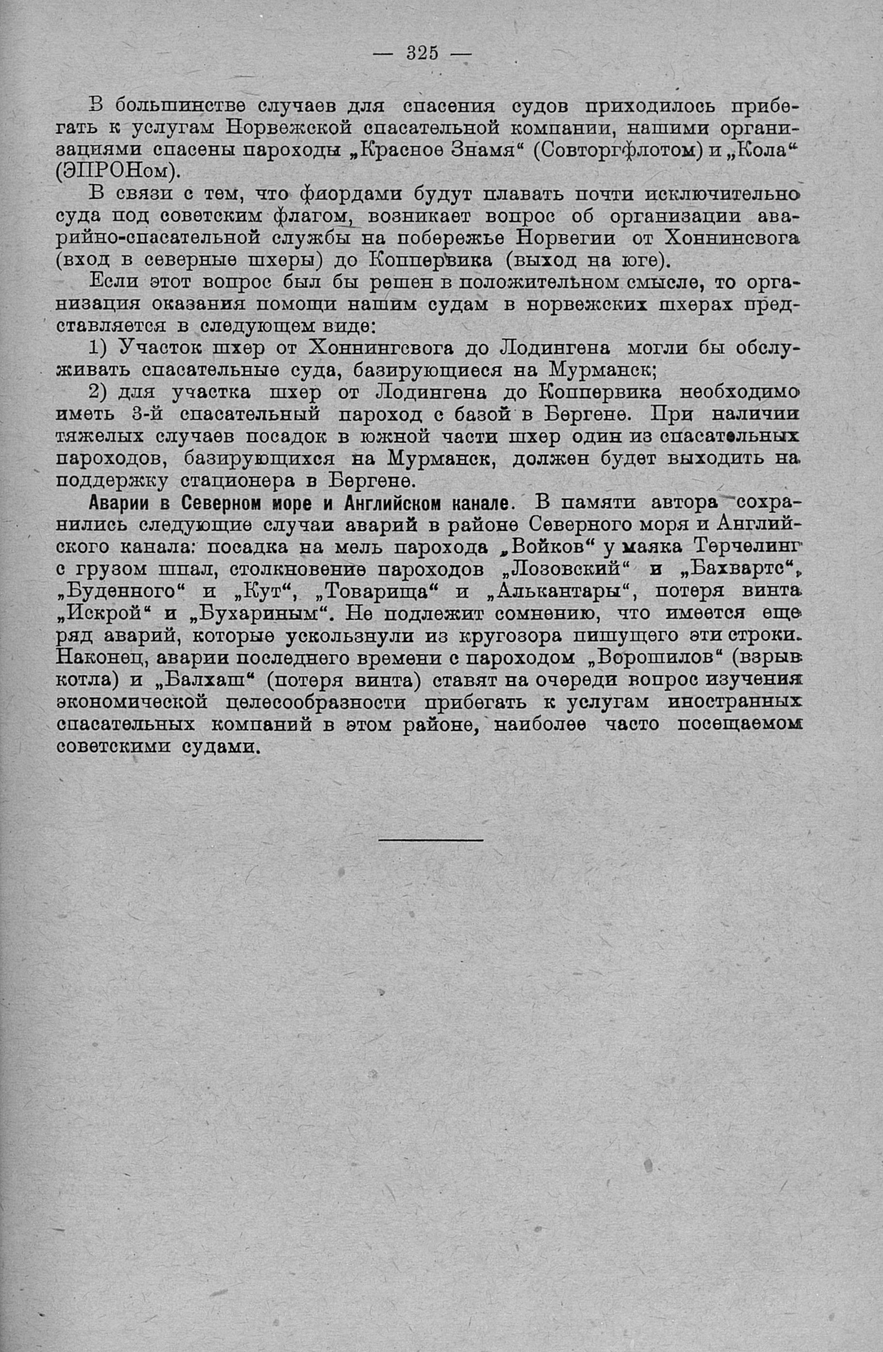 Аварии в Северном море и Английском канале. В памяти автора сохранились следующие случаи аварий в районе Северного моря и Английского канала: посадка на мель парохода "Войков" у маяка Терчелинг с грузом шпал, столкновение пароходов "Лозовский" и "Бахвартс", "Буденного" и "Кут“, "Товарища" и "Алькантары", потеря винта "Искрой" и "Бухариным". Не подлежит сомнению, что имеется еще ряд аварий, которые ускользнули из кругозора пишущего эти строки. Наконец, аварии последнего времени с пароходом "Ворошилов" (взрыв котла) и "Балхаш" (потеря винта) ставят на очереди вопрос изучения экономической целесообразности прибегать к услугам иностранных спасательных компаний в этом районе, наиболее часто посещаемом советскими судами.