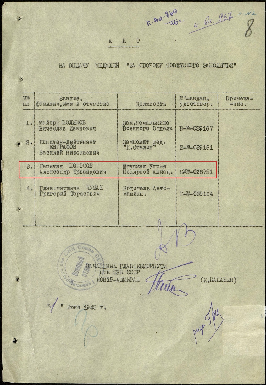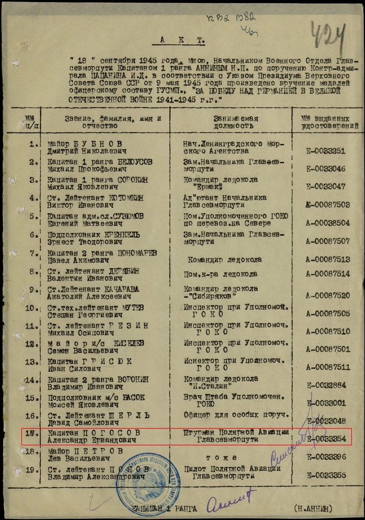 Этого молодого человека я хорошо знал, и его храбрость, и страсть к розыгрышам. В лагере челюскинцев он был комсоргом. Я знал: если Погосову что-то поручили, выполнит к сроку. Мы встречались много раз и до нашего дрейфа на льдине, и после возвращения. А ближе всего судьба свела нас в годы Великой Отечественной войны, когда мы вместе работали в Мурманске и Архангельске. Иностранных судов приходило много, и с их капитанами Саша очень быстро находил общий язык. Покорял Саша иностранцев и знанием английского языка, и знанием дела, и тем, что не бросал это дело во время бомбежки.