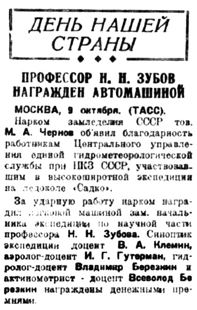 Так же активно и оперативно реагировал Н. Н. Зубов на научные результаты, поступавшие с ледокольного парохода «Седов», который в 1938–1940 годах находился в вынужденном дрейфе. В этот период он публикует в различных научных и общественно-политических периодических изданиях статьи о значении дрейфа для развития науки о льдах и делает глубокие научные выводы. Они получат стройное оформление в фундаментальной книге Зубова «Льды Арктики», материалы для которой он тщательно собирал в течение многих лет. (О ней — речь впереди.)