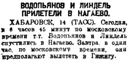 ХАБАРОВСК, 14 (ТАСС). Сегодня, в 6 часов 45 минут во московскому времени тт. Водопьянов и Линдель спустились в Нагаево. Завтра, в один час, по московскому времени, они предполагают вылететь в Гижигу.