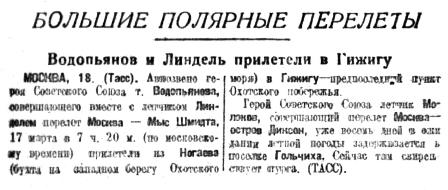 Тов. Водопьянов 17 марта вылетел в Гижигу
