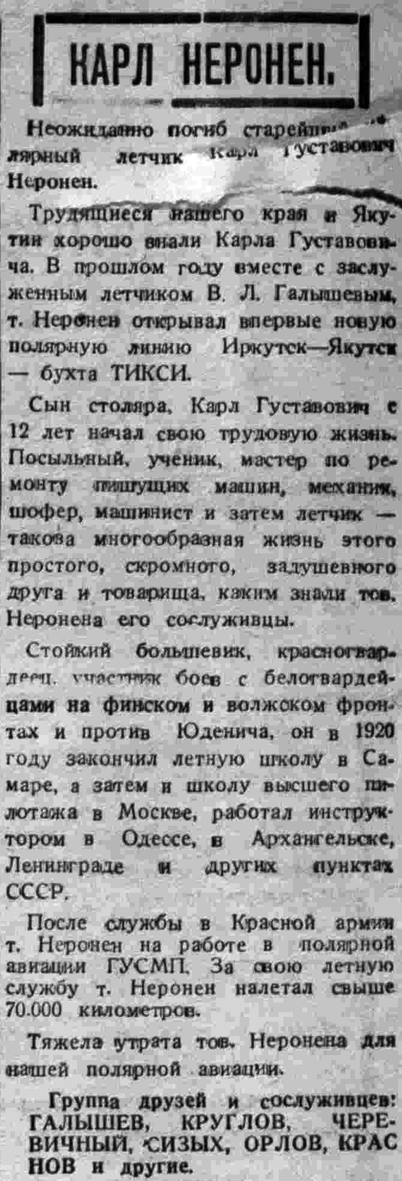 — Полярную авиацию постигла большая потеря, — писала газета „Советская Якутия": — трагически погиб смелый полярный летчик К. Г. Неронен.