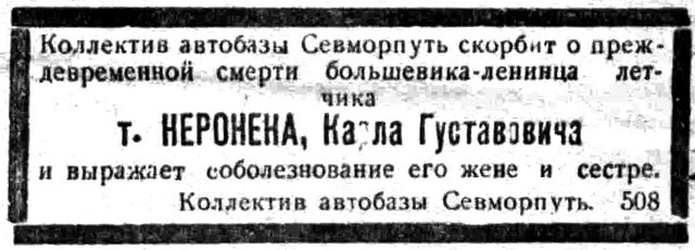 ЯКУТСК, 30 (по телеграфу). Якутский областной комитет партии и Совнарком Якутии скорбят о преждевременной смерти славного полярного летчика-большевика Карла Густавовича Неронен. Обком ВКП(б) и Совнарком уверены, что коллектив авиослужбы ГУСМП ответит на трагическую смерть товарища Неронена лучшей организацией авиодела на Крайнем Севере, полным овладением летной техники, а это приведет к новым победам полярную советскую авиацию.