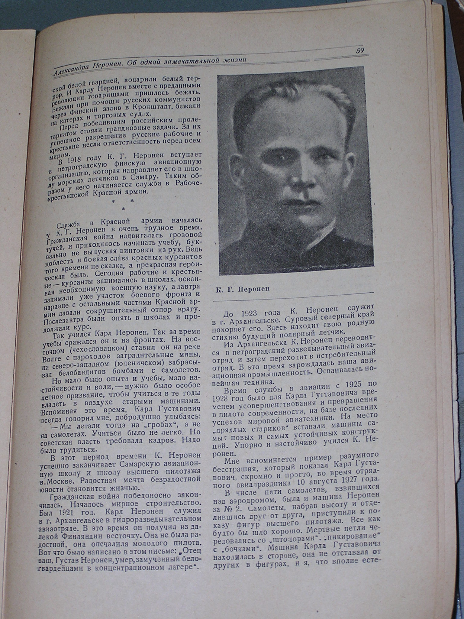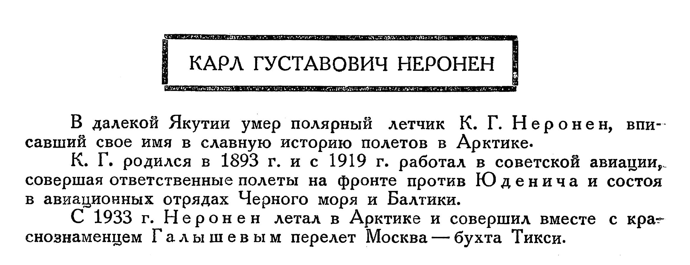 — Полярную авиацию постигла большая потеря, — писала газета „Советская Якутия": — трагически погиб смелый полярный летчик К. Г. Неронен.