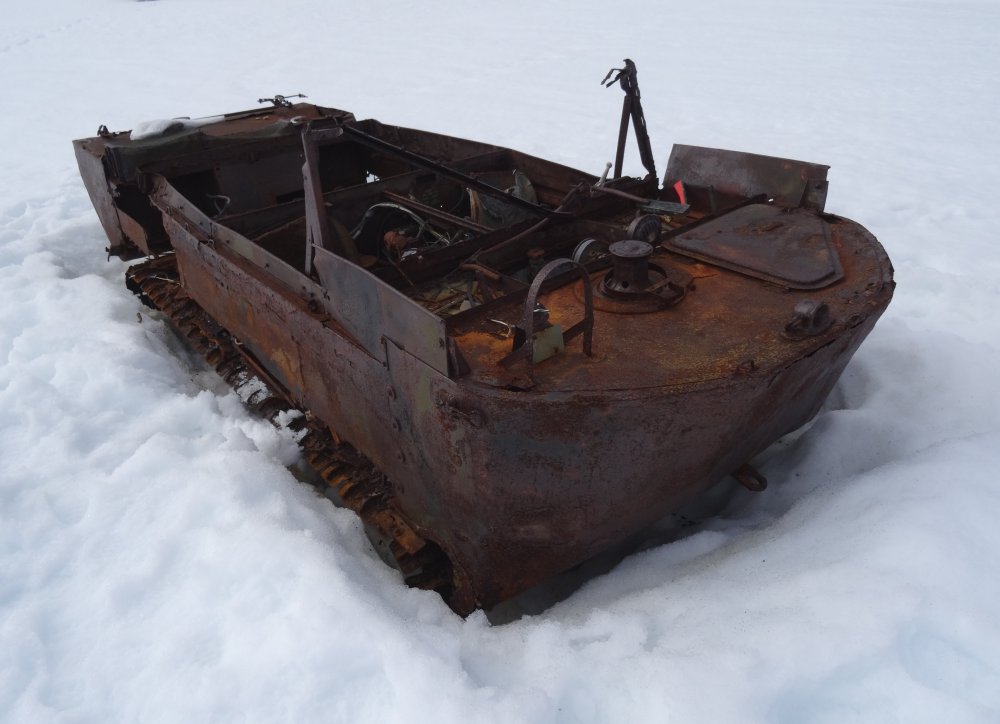 Судя по архивным фотографиям, этот маленький вездеход времен 2-ой мировой войны, использовался в Барроу сотрудниками NARL. Насколько я понимаю, со временем они заменили брезентовый верх цельнометаллическим, и покрасили в более яркий цвета, для лучшего обнаружения.