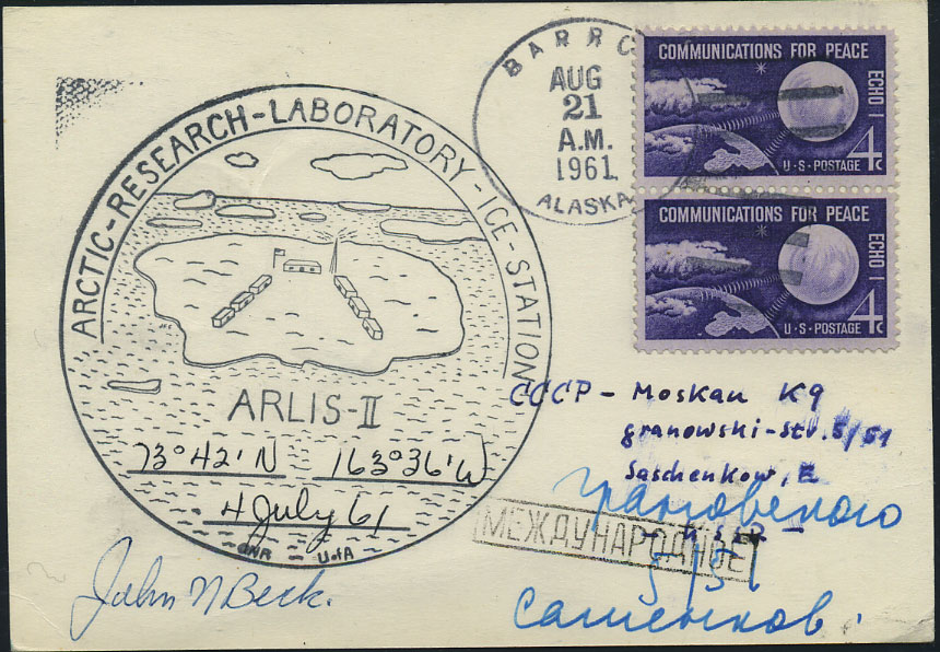 В день высадки производилось гашение почты календарным почтовым штемпелем ледокола. На самой же дрейфующей станции, как и прежде, почтового оффиса не было. Использовались два больших сопроводительных штемпеля. Иногда ставили одновременно оба штемпеля, и тогда один из них пришлось помещать на обороте конверта. Прямоугольный штемпель включал указание даты и времени, а также предусматривал место для широты и долготы. Столбиком помещены слова, образующие сокращение «Арлис». На рисунке — плывущий в море ледовый остров с сооружениями станции. Второй штемпель, не имеющий рамки, также изображает станцию на льдине. Из вписанных от руки обозначений явствует, что в день высадки 11 сентября 1960 г. у станции «Арлис-1» были следующие координаты: 75° 12' сев. шир. и 136°22' зап. долг.