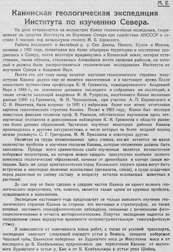 На днях отправляется на полуостров Канин геологическая экспедиция, снаряженная на средства Института по Изучению Севера при содействии АНСССР в составе 5 человек под начальством геолога М. Б. Едемского.