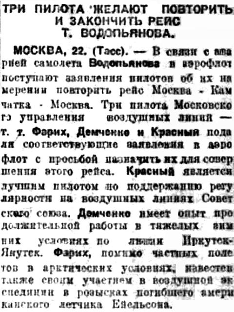 В связи с аварией самолета тов. Водопьянова в Аэрофлот поступают заявления пилотов об их намерении повторить рейс Москва—Камчатка—Москва. Три пилота Московского управления воздушных линий тт. Фарих, Демченко и Красный подали заявления в Аэрофлот с просьбой назначить их на совершение этого рейса. (ТАСС).