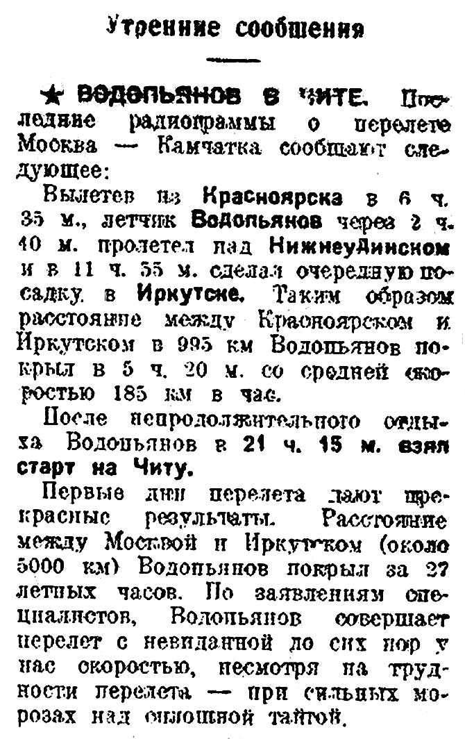 Первые дни перелета дают прекрасные результаты. Расстояние между Москвой и Иркутском (около 5000 км) Водопьянов покрыл за 27 летных часов. По заявлениям специалистов, Водопьянов совершает перелет с невиданной до сих пор у пас скоростью, несмотря па трудности перелета — при сильных морозах над сплошной тайгой.