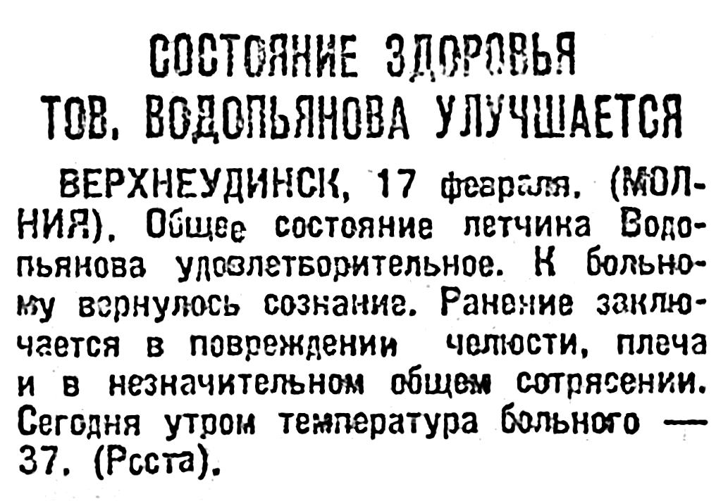 ВЕРХНЕУДИНСК. 17 февраля. (МОЛНИЯ). Общее состояние летчика Водопьянова удовлетворительное. К больному вернулось сознание. Ранение заключается в повреждении челюсти, плеча и в незначительном общем сотрясении. Сегодня утром температура больного — 37. (Роста).
