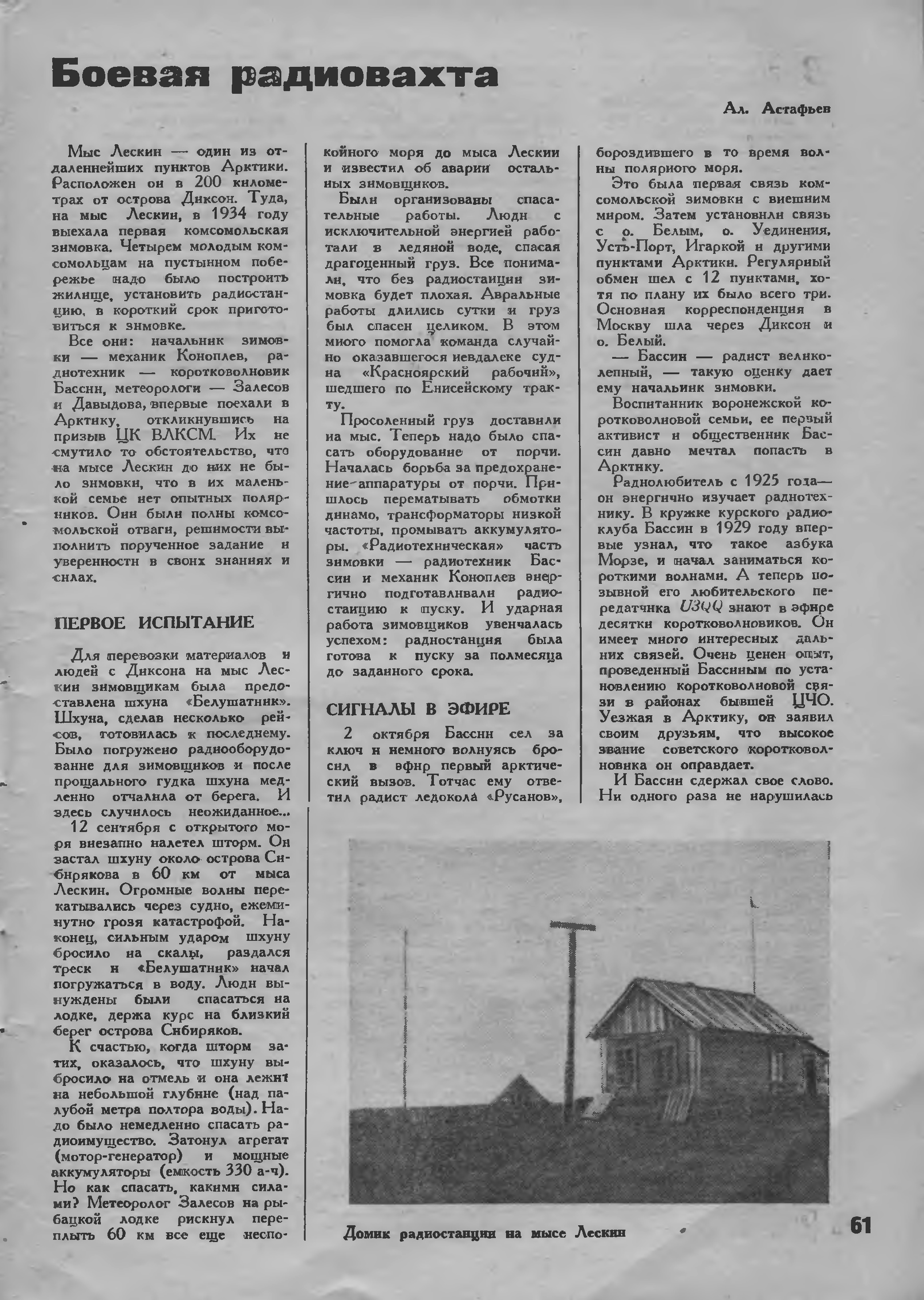 регулярная связь рации мыса Лескин. Так же четко работал коротковолновик-полярник в дни прилета на Диксон самолета Молокова, когда СУТОЧНЫЙ радиообмен доходил до 6 000 слов (вместо обычных 400—600).