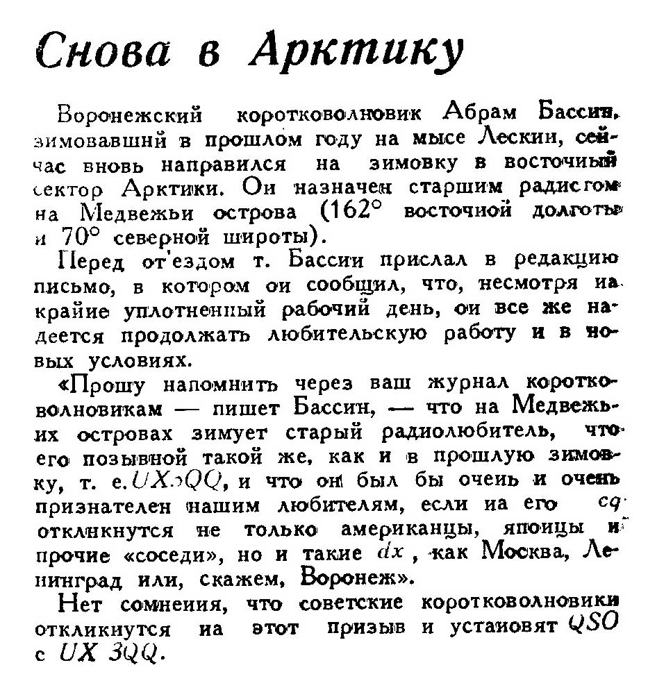 Бассин устанавливает связь с Новосибирском, Казанью, Горьким, Киевом, Ленинградом, Ташкентом, своим родным Воронежем. Все районы Советского союза за исключением Дальнего Востока принимал Бассин в Арктике. Особенно хорошая связь была с Воронежем, Томском и Усть-Усой районом в Северном крае).