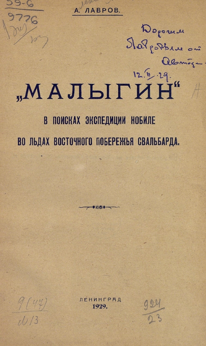 Лавров А. М. "Малыгин" в поисках экспедиции Нобиле во льдах восточного побережья Свальбарда. - Ленинград : б. и., 1929. - [2], 96-110 с., 1 л. карт.