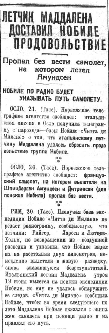 Общее количество людей, занятых в экспедициях по спасению спутников Нобиле, достигает шифры 1500. Результаты же пока ничтожны.