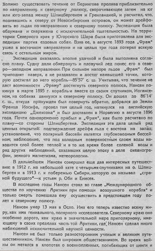 Депеша из Иркутска, извещавшая о благополучном возвращении Нансена из его экспедиции в район обитаемых земель, облетела весь свет. Но депеша шла из далека, от купца Кушнарева, поставщика Нансена, из глухого угла северной Сибири; известие было встречено даже с некоторым недоверием. Однако через несколько времени после того, новая телеграмма, на этот раз уже от английского консула, живущего в Архангельске, вновь возродила надежды, которые еще более подтвердились, когда, на днях, последняя телеграмма из Иркутска, подтвердила, что из Устьянска явились в Иркутск проезжие, удостоверяющие сообщение Кушнарева. По-видимому, Нансену самом деле удалось пробиться назад, к берегам населенного мира. Но достиг ли он в самом деле полюса? Этот вопрос он в скором времени будет в состоянии разрешить самолично.