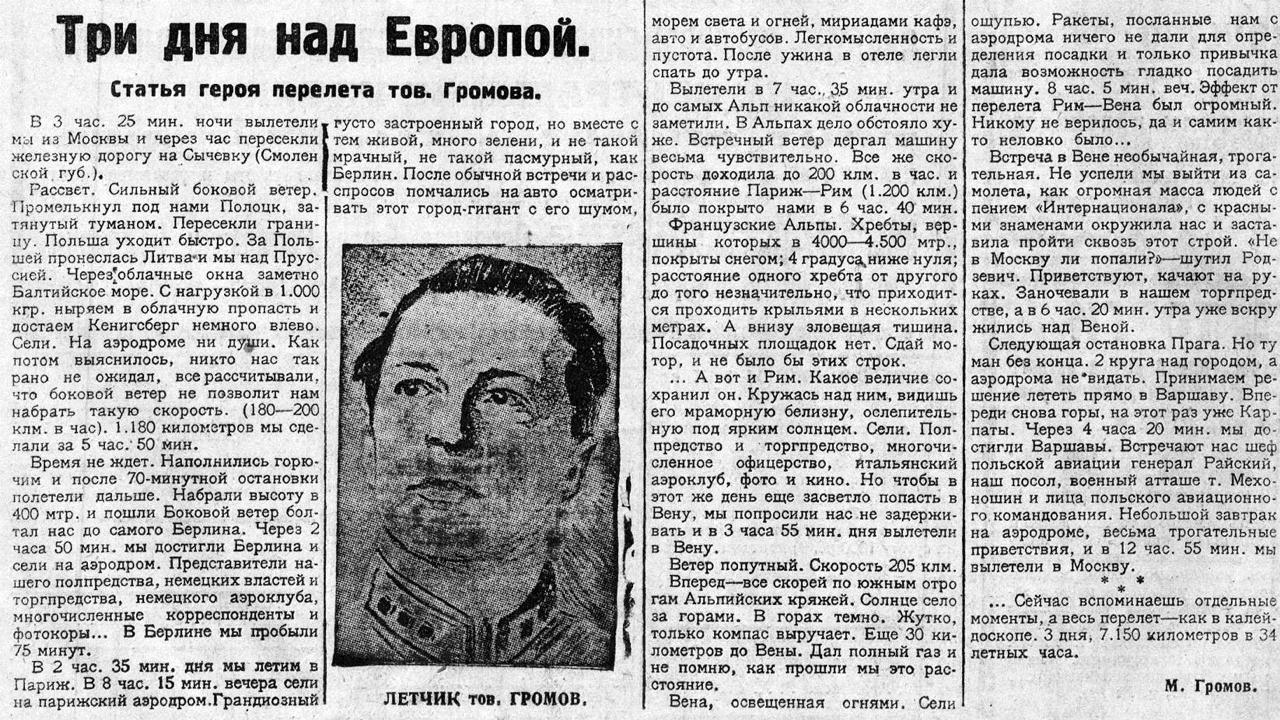 На-днях из Москвы вылетел в большой круговой перелет по Европе заслуженный летчик тов. Громов с механиком Родзевичем.