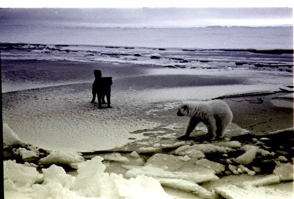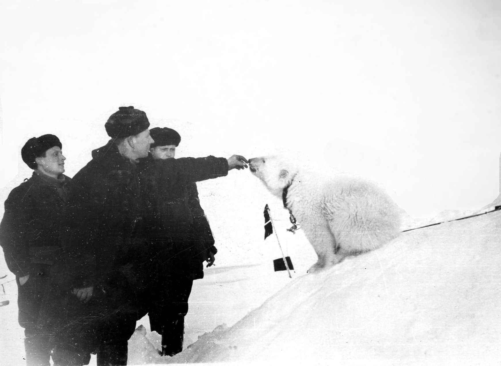 Наконец счастье улыбнулось нам. Однажды ко мне в домик вбежал в крайне возбужденном состоянии дежуривший в этот день по лагерю фотокорреспондент Михаил Иванович Савин и сообщил, что только сейчас видел двух медведей, которые роются в сложенных на аэродроме ящиках со снаряжением. Эта весть мгновенно облетела лагерь, и когда мы с Гудковичем, захватив винтовки и фотоаппараты, выскочили из домика, то увидели большой вооруженный отряд, спешивший на защиту лагеря. Такая облава нас не устраивала. Хотелось сфотографировать зверей в естественной обстановке. Поэтому, оставив половину охотников в тылу, мы, держа наготове фотоаппараты и укрываясь за лагерными постройками и холмами, пошли навстречу медведям. Подойдя на 50 м, мы увидели показавшуюся из-за холма медведицу, а рядом с ней и маленького медвежонка. Заметив нас, медведица крупными прыжками направилась к нам. Тут уж было не до фотографирования. Уложив несколькими выстрелами зверя, мы с помощью Малыша поймали медвежонка и, надев на него ошейник, посадили на длинный трос в центре лагеря. Медвежонок быстро освоился в новой обстановке и даже подружился с нашим Малышом. Он не только брал пищу из рук, но и позволял себя гладить. Вскоре Пятерка, как мы его прозвали, стал общим любимцем полярников. Каждый старался угостить его чем-нибудь вкусным. Выходишь после обеда из кают-компании, а медвежонок уже летит к тебе со всех ног и, поднявшись на задние лапы, смотрит, чем ты его собираешься угостить. Если на него не обращаешь внимания, то медвежонок начинает ворчать, а то и пускает в ход лапы. На наших харчах он быстро рос и вскоре, оборвав трос, убежал. Случилось это ночью на вахте Кизино. Долго он гонялся за медвежонком с бутылкой молока, но поймать так и не смог. Помешали собаки.