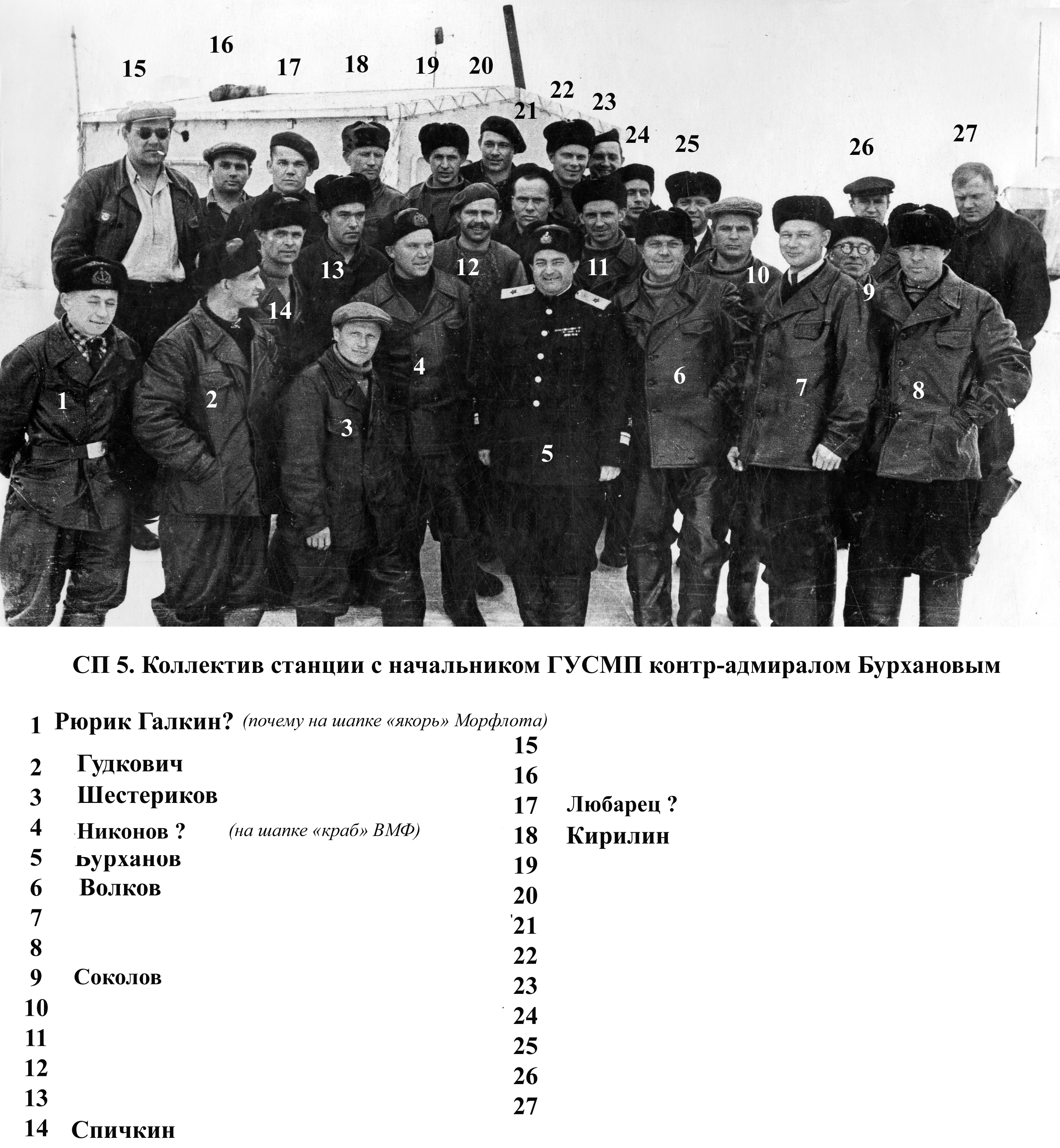 2. С попыткой разобраться - кто есть кто. И здесь без вашей помощи, уважаемые форумчане, не обойтись. Подключайтесь, опознавайте! В этом разделе (и в личном разделе А.И.Кирилина) есть много изображений полярников с СП 5. Я попытался идентифицировать некоторых, но, боюсь, что не всех угадал.