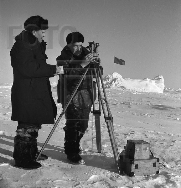Научно-исследовательская дрейфующая полярная станция "Северный полюс-5" (СП-5). Северный полюс. Заместитель начальника экспедиции по науке Вячеслав Фролов и заместитель начальника экспедиции, геофизик Михаил Острекин ведут наблюдения. Апрель 1954