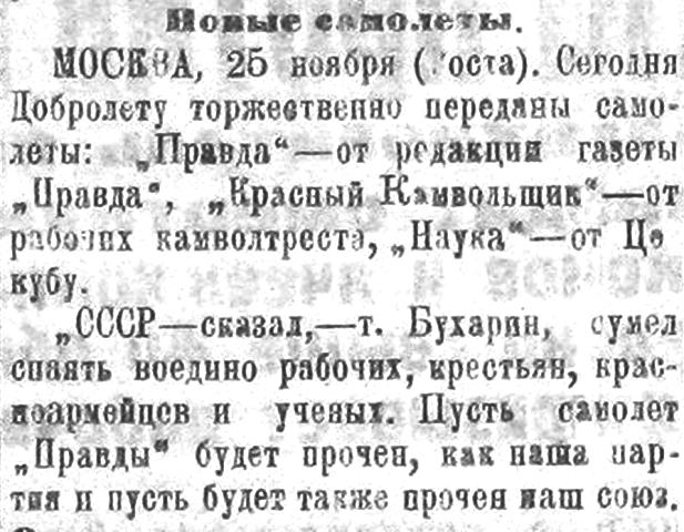 „СССР — сказал, — т. Бухарин, сумел спаять воедино рабочих, крестьян, красноармейцев и ученых. Пусть самолет "Правды" будет прочен, как наша партия и пусть будет также прочен наш союз.