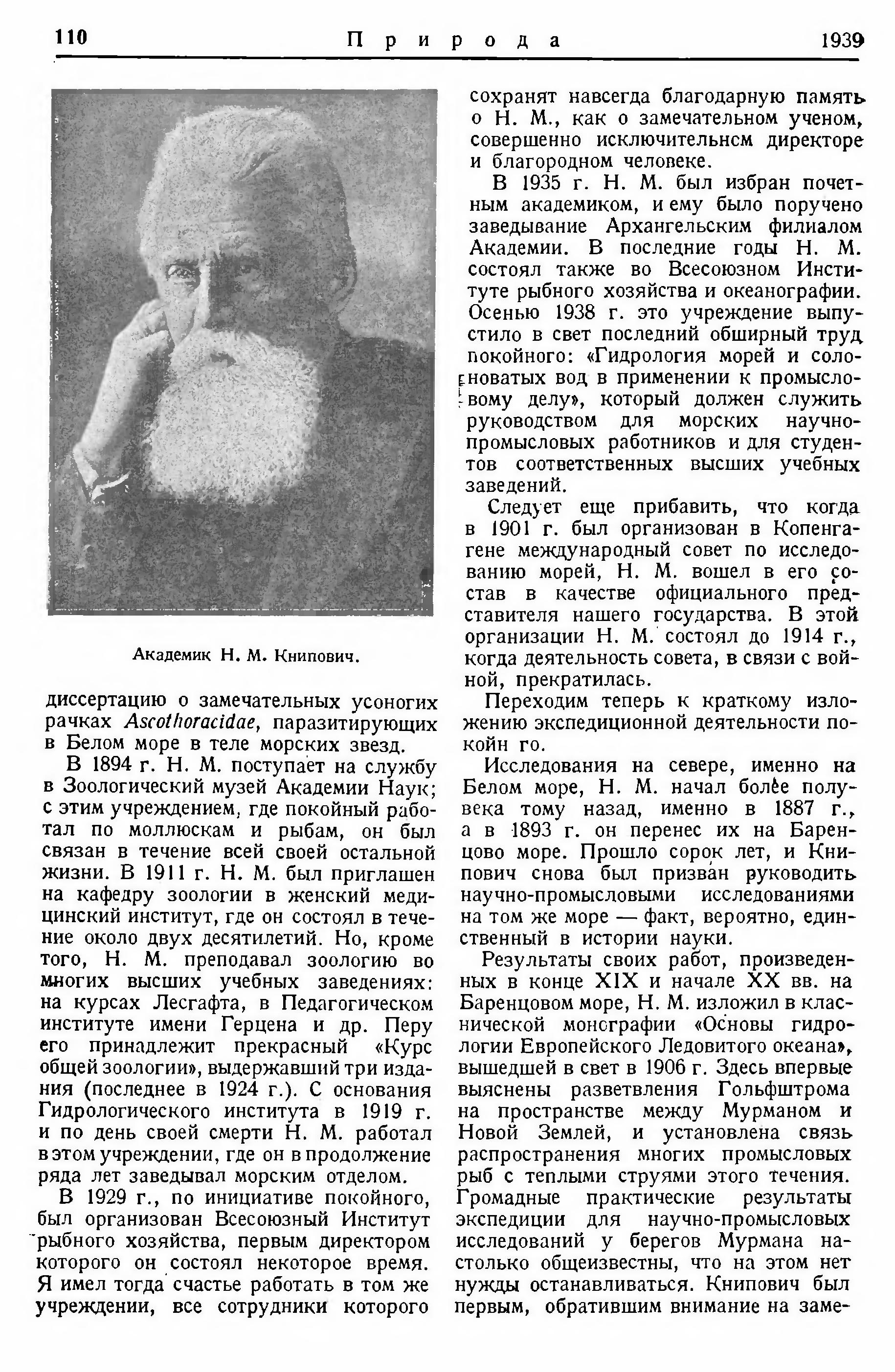 23 февраля,1939 г. после припадка сердечной болезни, скончался в исходе 77-го года жизни почетный академик Николай Михайлович Книпович. Покойный на протяжении всей своей жизни отличался завидным здоровьем, и только с осени 1938 г. он начал жаловаться на сердце. Еще накануне смерти Н. М. чувствовал себя таким бодрым, что 26 февраля собирался ехать в Москву, но судьба решила так, что 26 февраля мы проводили этого замечательного ученого в могилу.