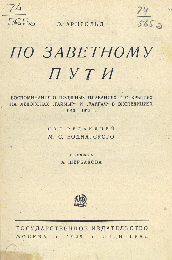Арнгольд Э. По заветному пути : Воспоминания о полярных плаваниях и открытиях на ледоколах "Таймыр" и "Вайгач" в экспедициях 1910-1915 гг./ Под ред. М. С. Боднарского . Госиздат, М.-Л., 1929