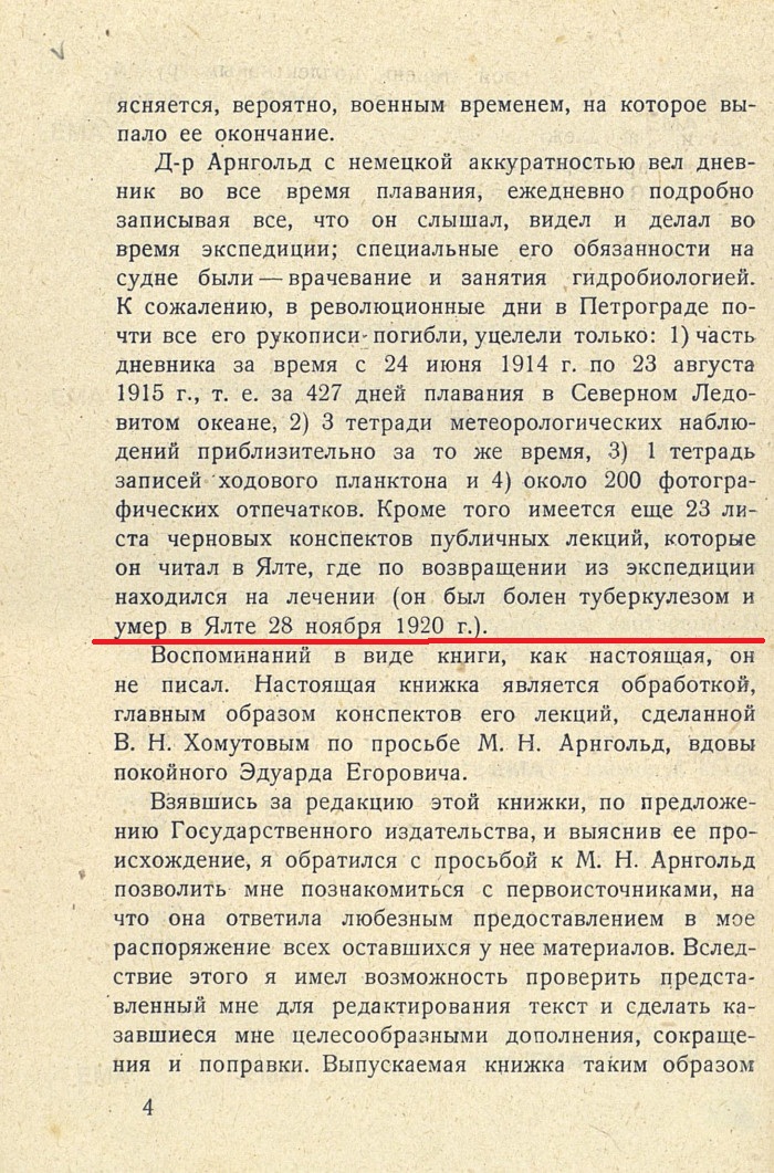С немецкой аккуратностью доктор Арнгольд вел дневник в течение всего плавания, подробно записывая все, что он слышал, видел и делал. К сожалению, в революционные дни в Петрограде значительная часть его рукописей погибла. Тем не менее, по остаткам материалов, черновикам конспектов его лекций, которые он читал в Ялте, находясь на лечении от туберкулеза, его друзья и жена М. Н. Арнгольд в 1929 году, уже после смерти доктора, выпустили книжку «По заветному пути». Она явилась фактически первым, достаточно подробным описанием выдающейся экспедиции, сделавшей самое важное географическое открытие ХХ столетия – открытие арх. Северная Земля.