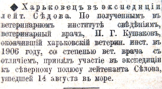 Харьковец в экспедиции лейт. Седова.По полученным в ветеринарном институте сведениям, ветеринарный врач, П. Г. Кушаков, окончивший харьковский ветерин. инст. в 1906 году, со степенью вет. врача с отличием, принял участие в экспедиции к северному полюсу лейт. Седова, ушедшей 14 августа в море.