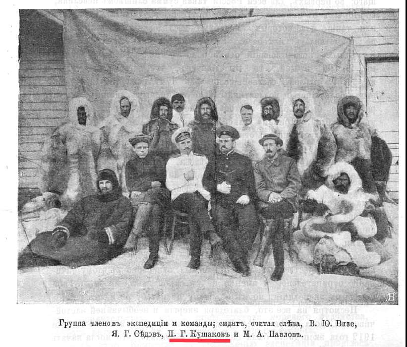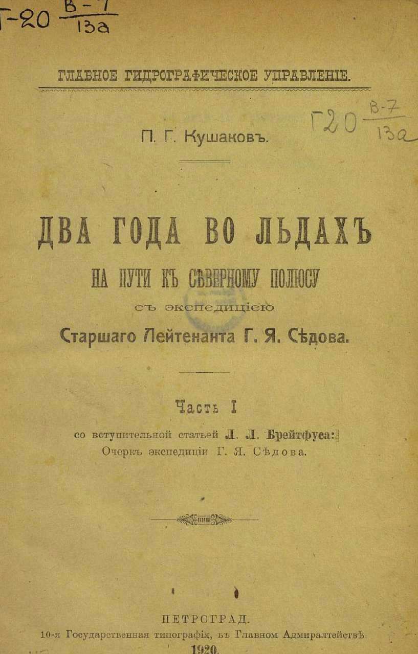 Нашел в Интернете книгу Павла Кушакова «Два года во льдах на пути к Северному полюсу с экспедицией старшего лейтенанта Г. Я. Седова. Часть I», изданную Главным Гидрографическим Управлением в Петрограде в 1920 году.